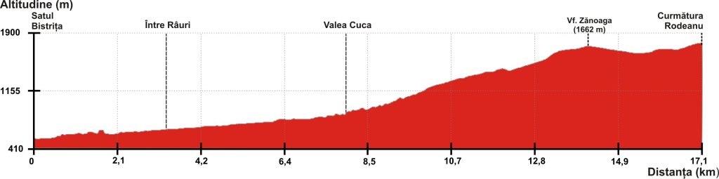 De la intersecţia drumurilor forestiere se porneşte pe drumul de pe Valea Cuca (dreapta). Se trece pe lângă clădirea din lemn a unui centru de colectare a fructelor (stânga) şi la trei sute de metri se ajunge la ramificaţia traseului 4 (marcaj cruce albastră). După aproape 4 km de la punctul „Între Râuri” se trece de fosta cabană I. F. Bistriţa, iar după încă 1 km se părăseşte drumul principal urcând pe drumul forestier din stânga, de pe Valea Cuca Mică. După cca. 500 m se traversează Pârâul Cuca Mică, apoi se urcă prin stânga acestuia spre obârşia lui. După circa jumătate de oră de urcat pe drumul secundar se ajunge la un izvor unde se află şi un adăpost. De aici traseul urcă în stânga pe un drum de tractor şi printr-o serpentină se înscrie în urcuş pe versantul vestic (zonă defrişată) al Pârâului Cuca Mică. După 15-20 minute ajungem într-o mică şa, la obârşia izvorului, unde se află un alt adăpost. De aici se intră în pădure şi în 5 minute se ajunge în culme, unde este un foişor de vânătoare, sub Vârful Cuca. De aici drumul trece pe versantul estic printr-o zonă defrişată şi coboară până într-o şa, numită „La Şipote” (izvor), unde se află în curs de desfăşurare exploatări forestiere. De aici, poteca urcă din greu pe culmea împădurită trecând prin vecinătatea unui mic canton de vânătoare aflat chiar la marginea pădurii. Înainte de vârful Zănoaga (1662 m) se urcă stâncăriile numite „Treptele Tribunalului” şi se iese în golul alpin. De aici marcajele sunt aplicate pe pietre, de cele mai multe ori la nivelul solului, însă orientarea este foarte uşoară, netrebuind decât să urmăm linia muchiei. Se urcă pe culmea Plaiului Zănoaga până într-un mic vârf, de unde se coboară spre stânele Zănoaga (izvor, două stâne şi un saivan). De aici se urcă pe drumul de tractor spre culmea principală (împădurită în această zonă), se trece pe lângă clădirea unei alte stâna şi când se ajunge la marginea pădurii de molid, drumul coteşte spre vest. Traseul merge o porţiune pe sub pădure, apoi intră în aceasta şi continuă relativ pe curbe de nivel prin pădure până în apropierea Curmăturii Rodeanu (1628 m), unde se află o stână şi unde intersectează drumul de tractor de pe creasta principală a Munţilor Căpăţânii.