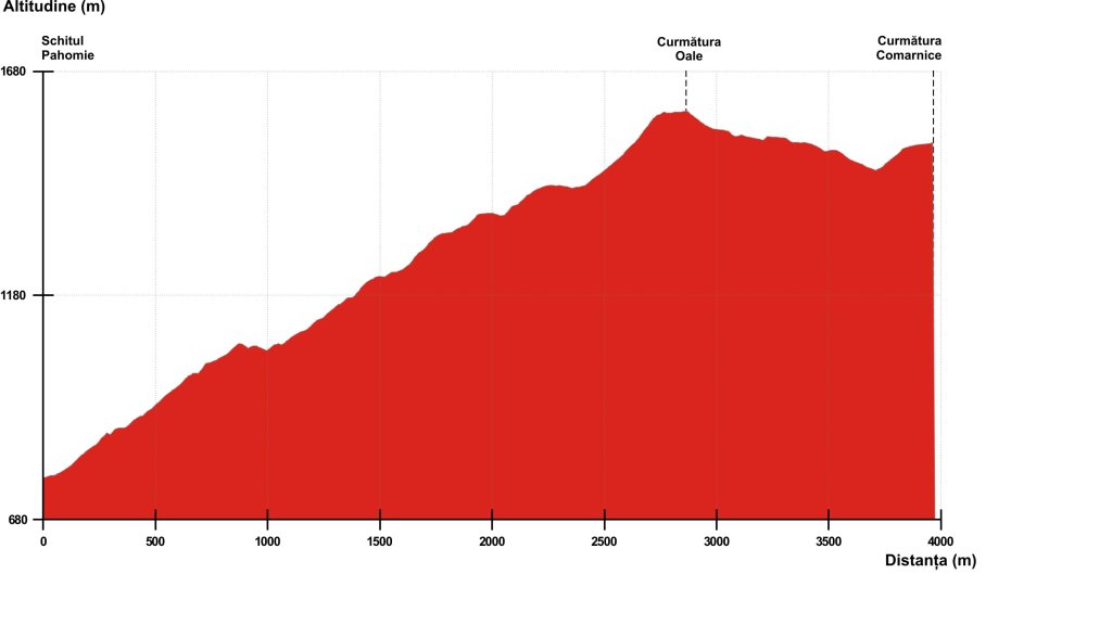 De la Schitul Pahomie coborâm pe drumul forestier spre Cheia, trecem de Izvorul Frumos şi după 100 m ajungem la indicatorul ce marchează punctul de plecare în traseu. Urcăm prin rarişte înspre est până în muchie, unde se află în curs o exploatare forestieră. De aici schimbăm direcţia şi urcăm spre nord pe muchie. După 10 minute depăşim exploatarea şi intrăm în pădurea bătrână de fag. Traversăm înspre dreapta câteva vâlcele seci, apoi urcăm accentuat pe o vale cu vegetaţie bogată şi ajungem după două ore de la plecare la stâna Oale (o clădire veche şi una nouă). De la stână urcăm înspre nord, intrăm în pădure şi într-o mică şa găsim un izvor. De la izvor urcăm din nou în dreapta şi ajungem într-o vale cu păşune, înconjurată de pădure. Urcăm pe vale, mai întâi prin partea dreaptă, pe marginea pădurii, apoi direct pe firul văii, până într-o zonă cu grohotiş în care valea se îngustează. Traversăm valea în dreapta şi intrăm în pădurea de molid. De aici poteca este mult mai clară. Urcăm înspre nord-est, traversăm câteva mici văi şi ieşim după 40 minute în creasta principală în Curmătura Oale (1450 m), unde se află stâlp indicator marcând intersecţia cu traseul nr. 11, marcat cu punct roşu.