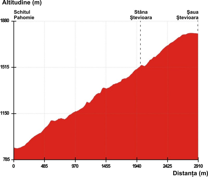 Schitul Pahomie (racord traseele 8, 10) – Stâna Ştevioara – Muchia Frumoasă – Şaua Ştevioara (racord traseul 11)